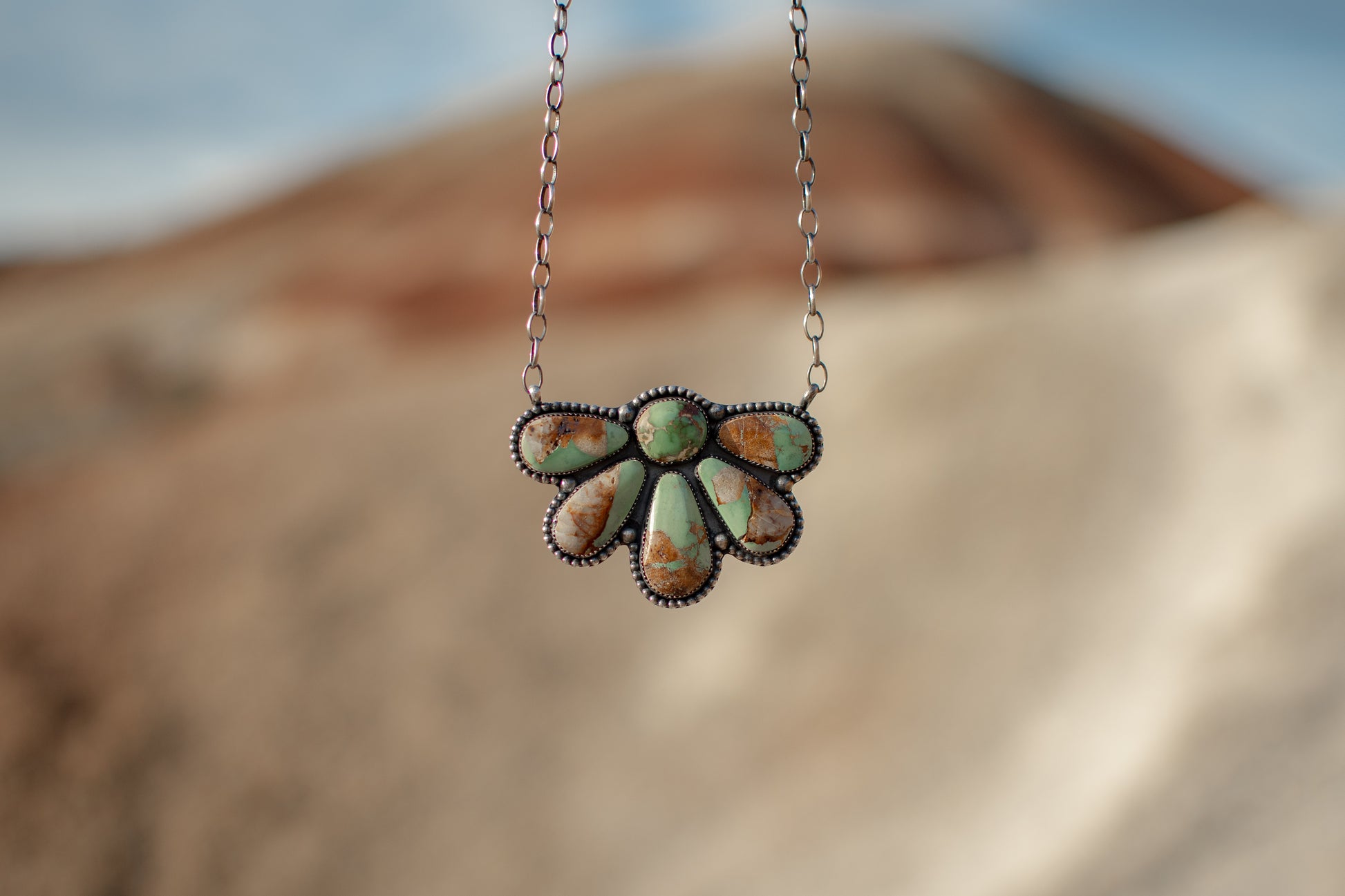The Buckle Bunny is your new go-to cowgirl statement piece. Crafted with stunning roystone stone and intricate beaded details in gorgeous hues, this necklace brings Western flair to any outfit. The durable 20-gauge backplate is built to withstand years of wear, making it a true heirloom treasure. An adjustable 18" chain ensures the perfect fit every time. Saddle up in style with this playful, eye-catching accessory that celebrates your inner cowgirl spirit.