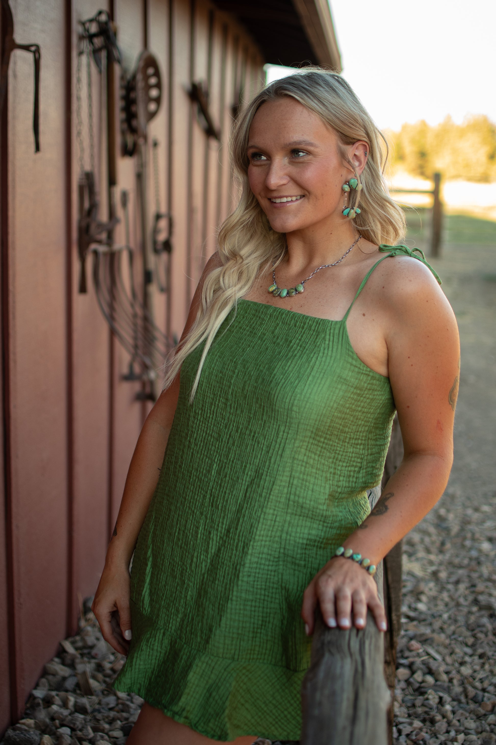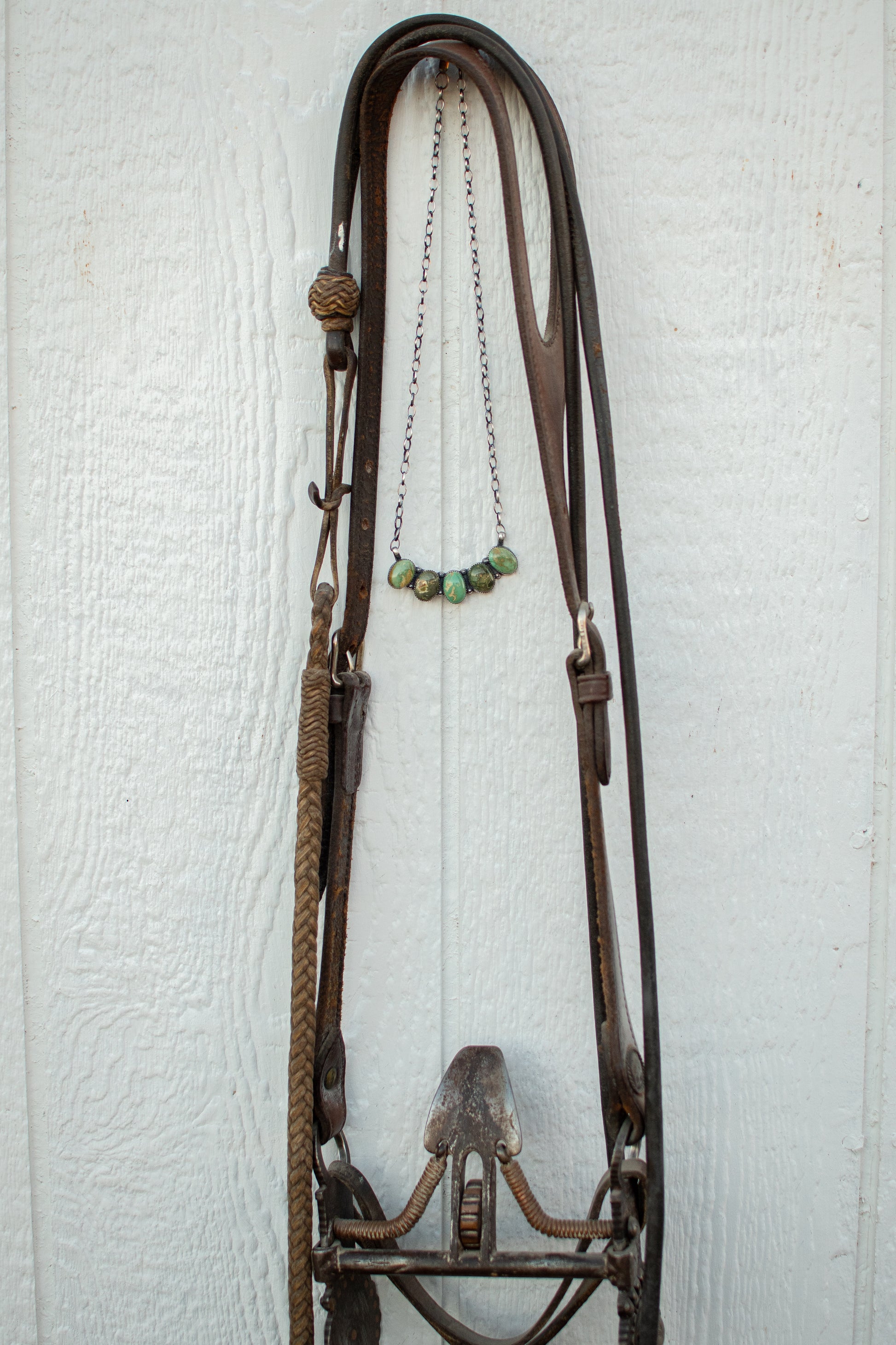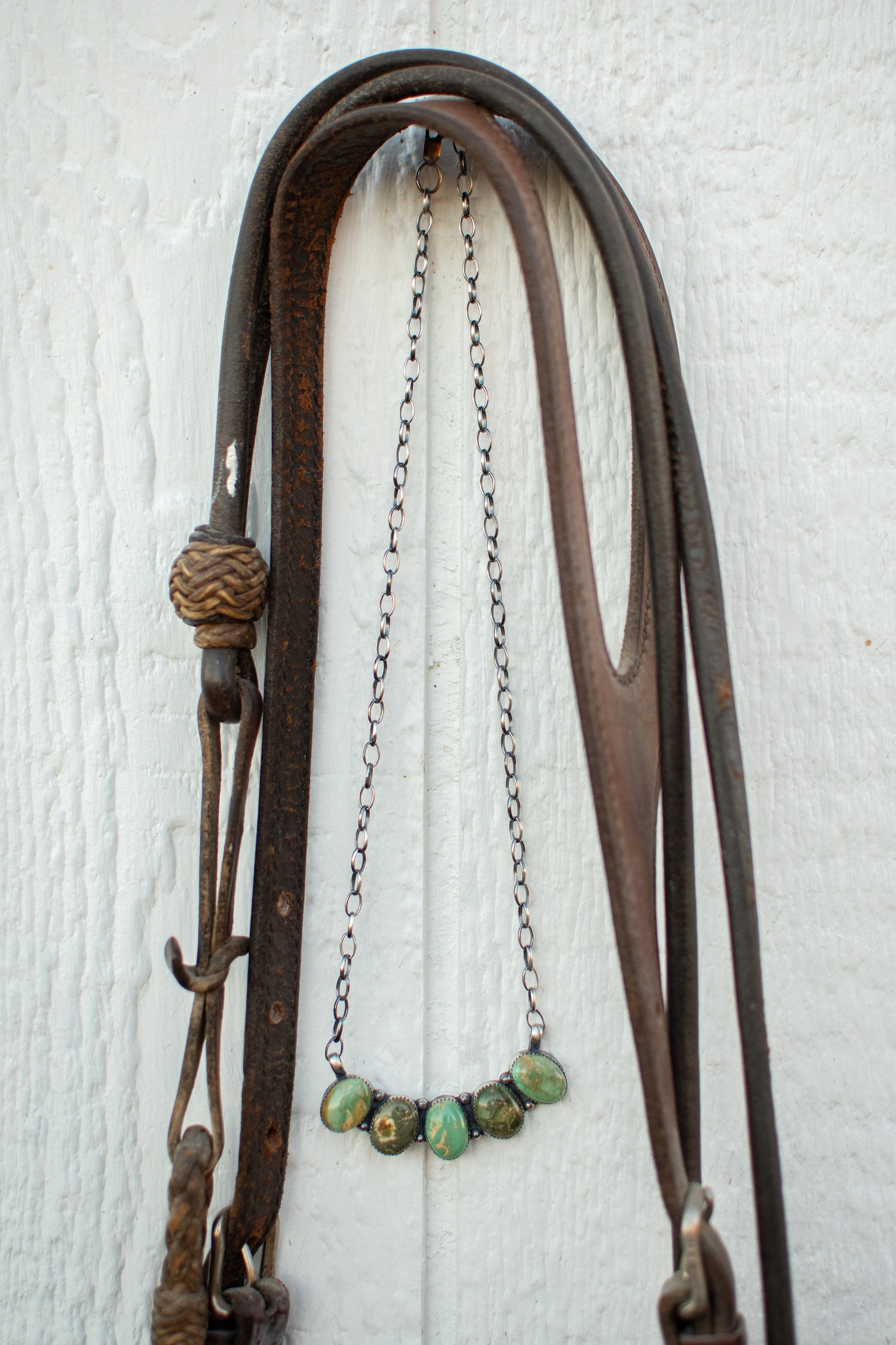 The Cathedral necklace features a playful mix of green and blue Evans stones on an 18-inch adjustable chain. This wild west-inspired piece makes the perfect statement, adding a splash of color and bold style to any outfit.