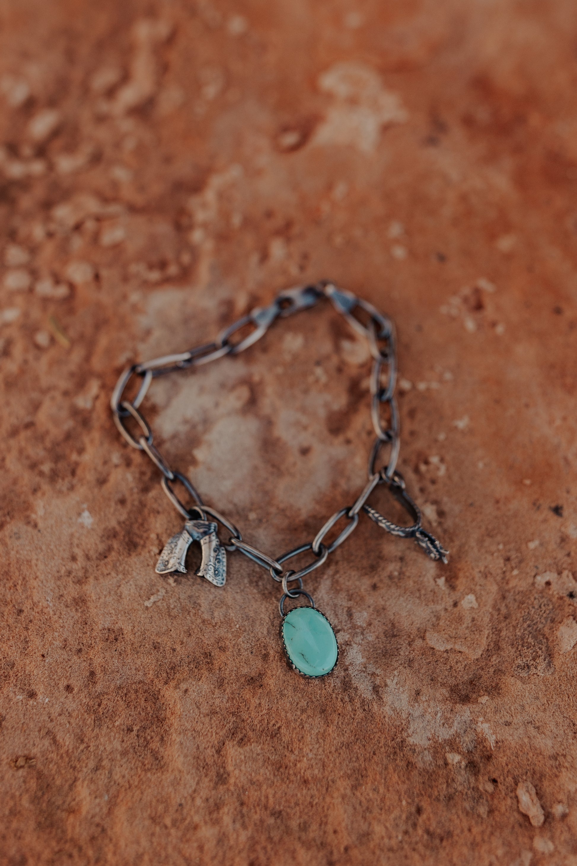 Meet The Collyns, your new charm-slinging sidekick! With an 8” chain that's just the right length (no awkward wrist wrestling here), this cowgirl-inspired bracelet flaunts stunning Kingman stone and sterling silver charms that jingle-jangle with every move. Perfect for adding a pinch of sass to your everyday outfit.
