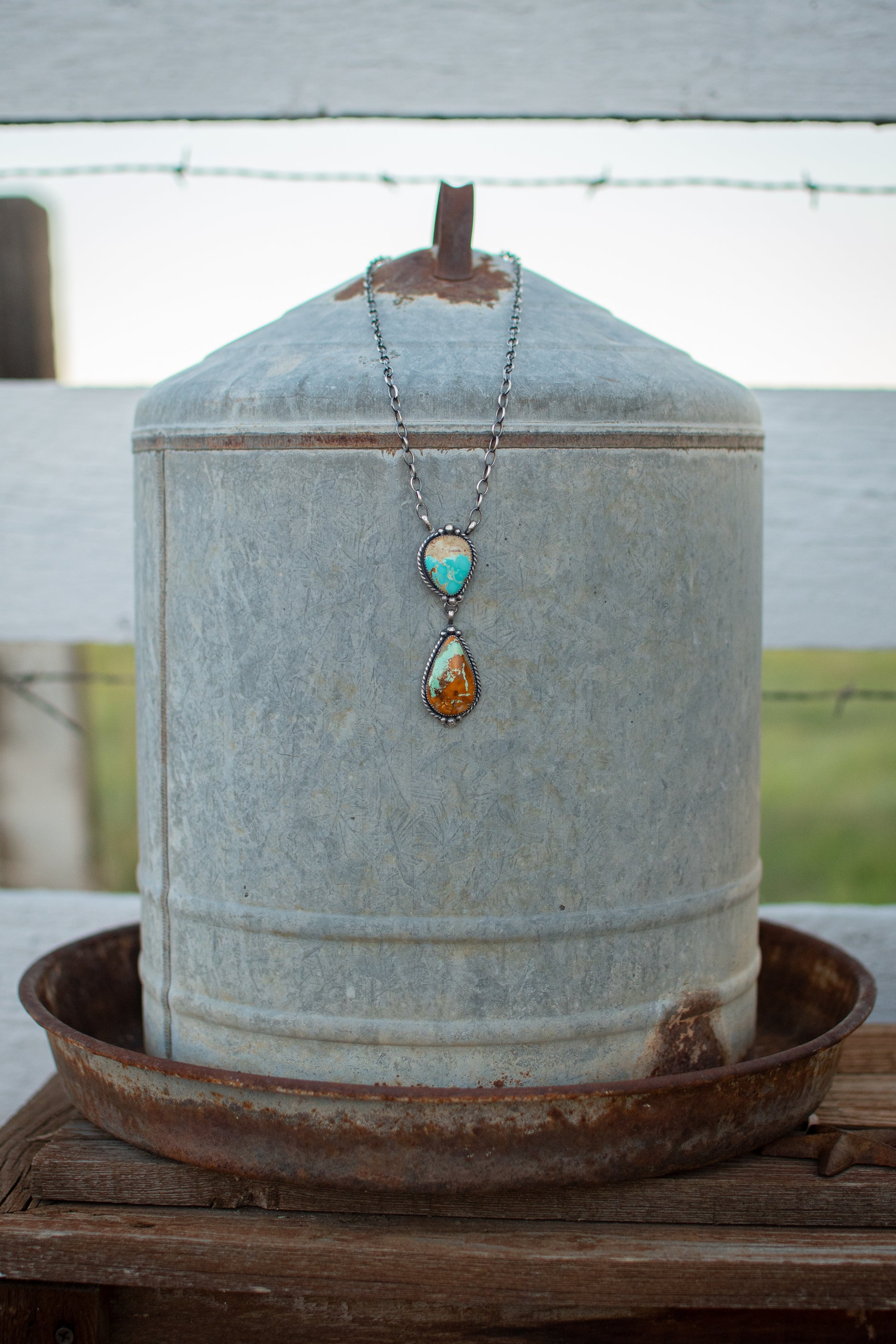 Unleash your wild side with The Correction necklace featuring Evan's stones and a twisted wire and beaded details. The 20" chain adds a touch of western flair to any outfit. Embrace edgy elegance and rock your unique style with this one-of-a-kind piece.
