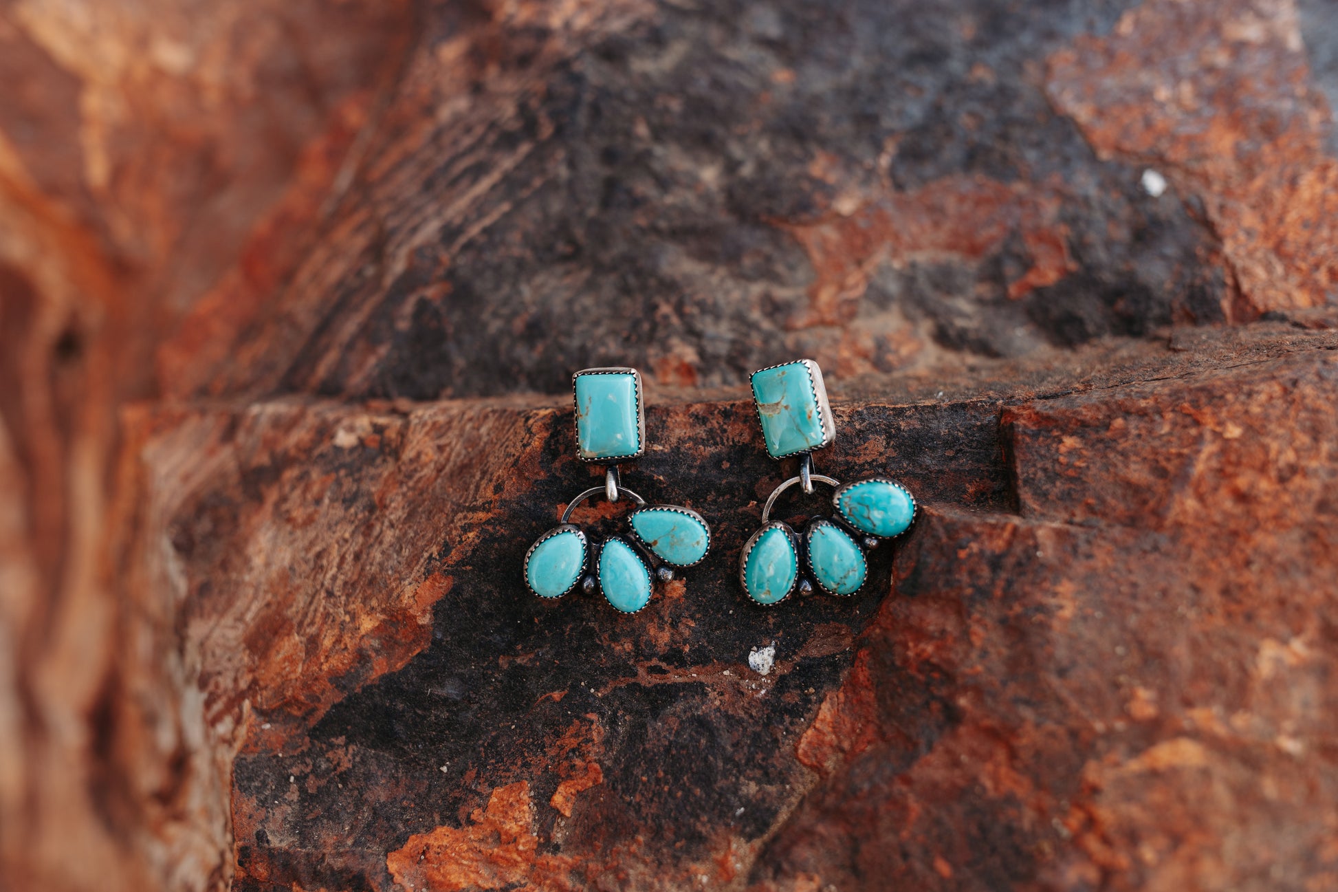 The Painted Horizon Drops, where Chilean turquoise meets wild west spirit. These lightweight beauties feature eye-catching studs that dance with every move, catching light like desert sunsets. Let your ears do the talking with earrings that pack personality and movement in one stunning package.