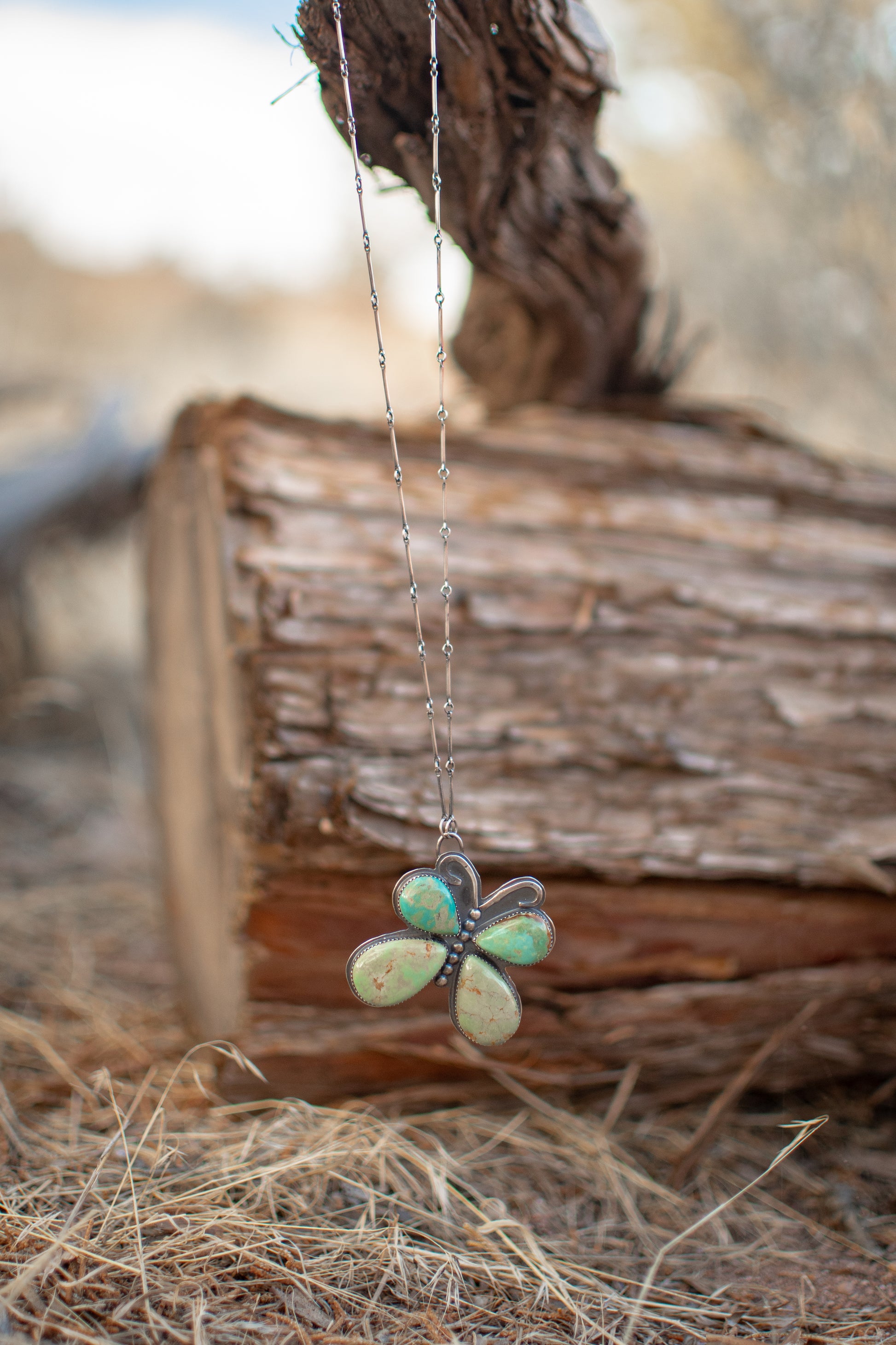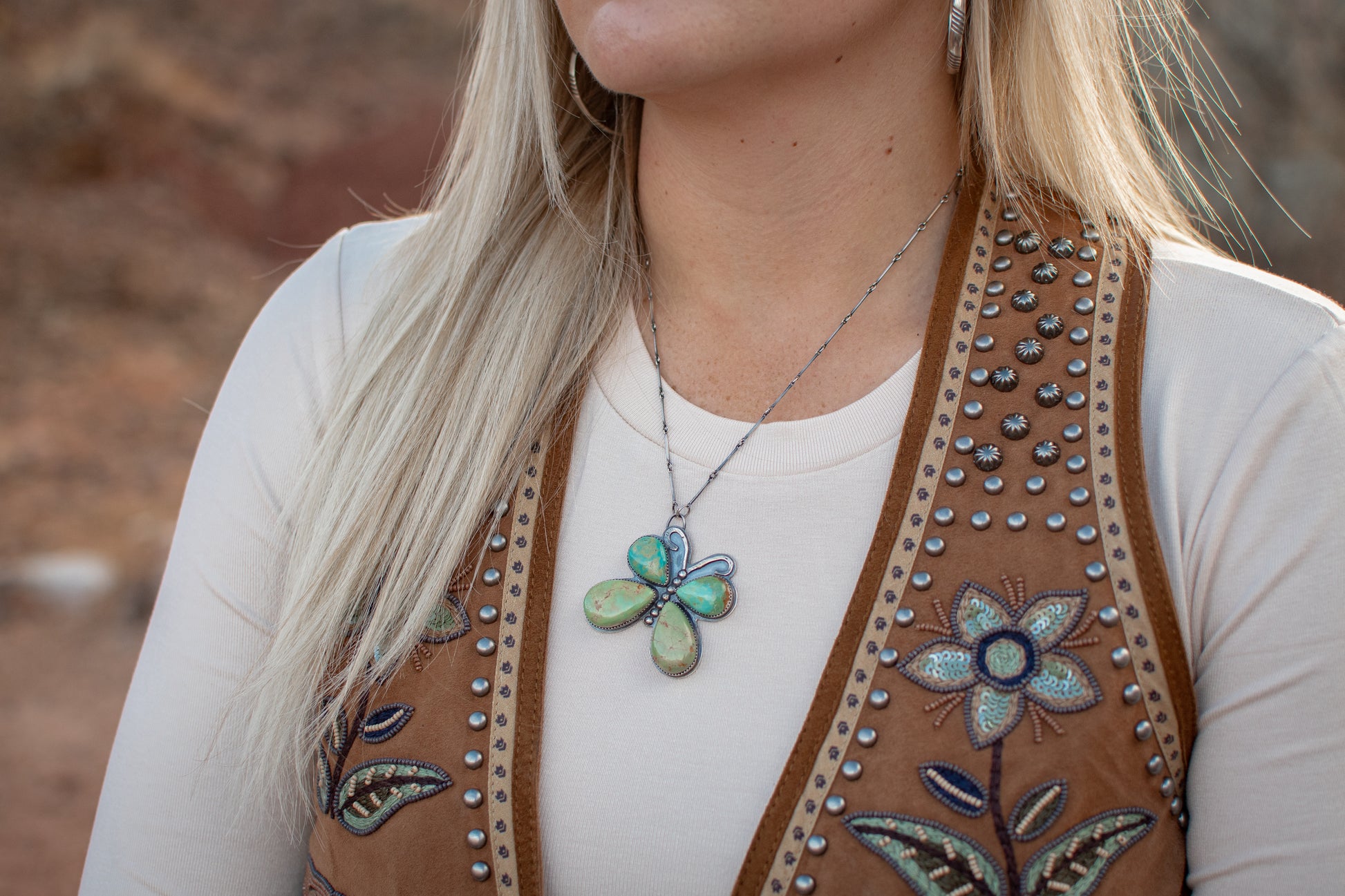 Lasso some serious style with The Rodeo Royalty, a cheeky necklace that celebrates frontier spirit with flair. This charming piece showcases a radiant Evans turquoise butterfly suspended from an 18-inch chain.