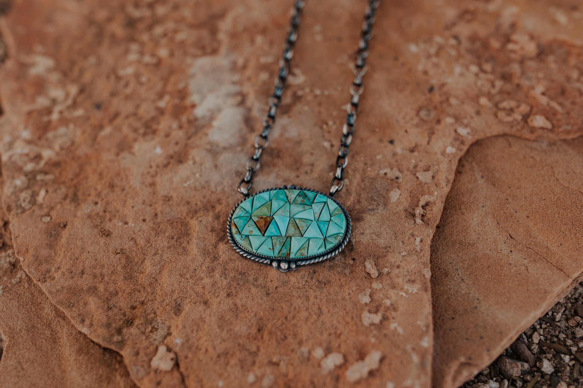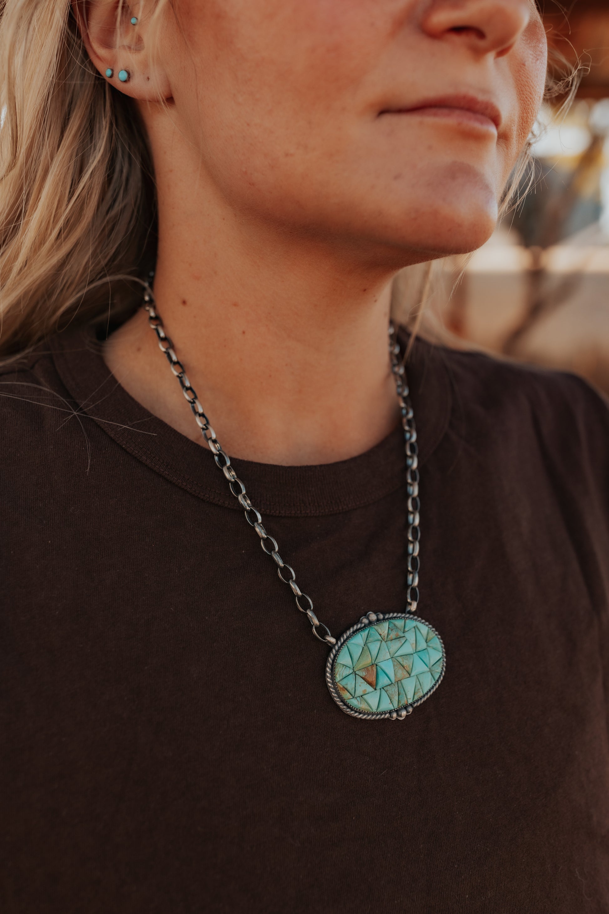 Meet The Rowdy: a one-of-a-kind jaw dropper that struts its stuff with mosaic turquoise glory! This 18” chain brings a simple yet sweet cowgirl charm to your neck.