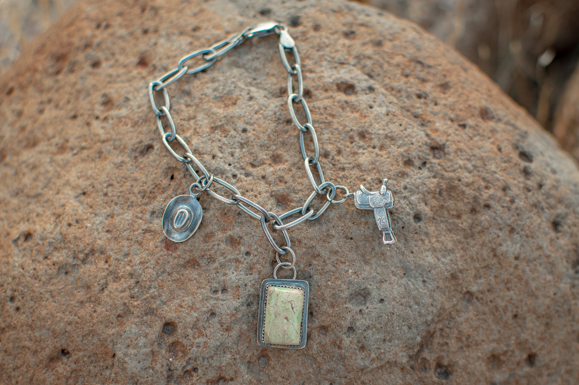 Meet your new favorite accessory—The Royal Flush, a sterling silver charm bracelet with serious cowgirl attitude. Showcasing a gorgeous Evans stone charm on an adjustable 8" chain, this piece slides on with ease and stays put all day long. Crafted from authentic sterling silver, it's tough enough for ranch life yet elegant enough for nights out. Whether you're channeling your inner buckaroo or just love western vibes, this playful bracelet delivers charm and character in one shimmering package.