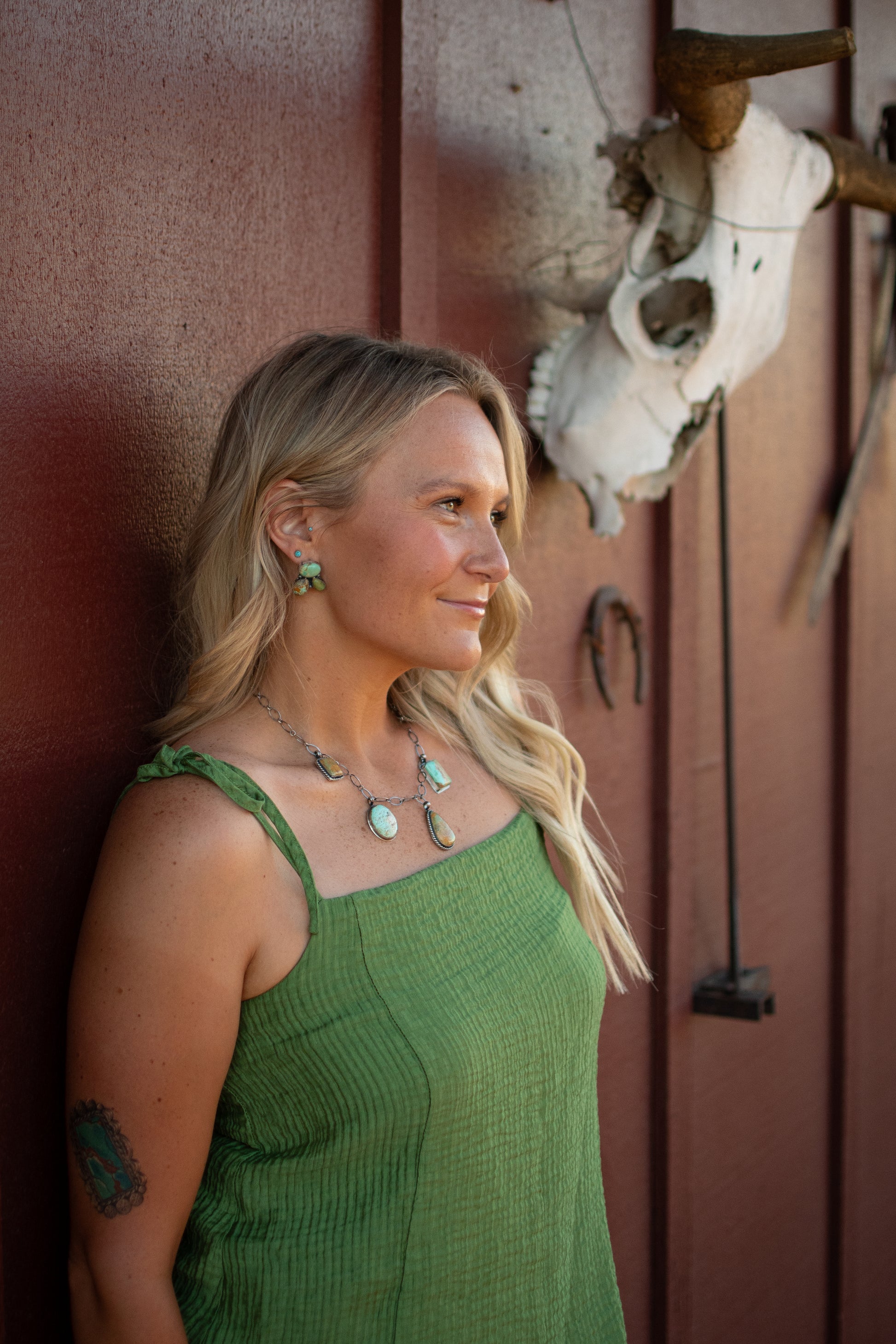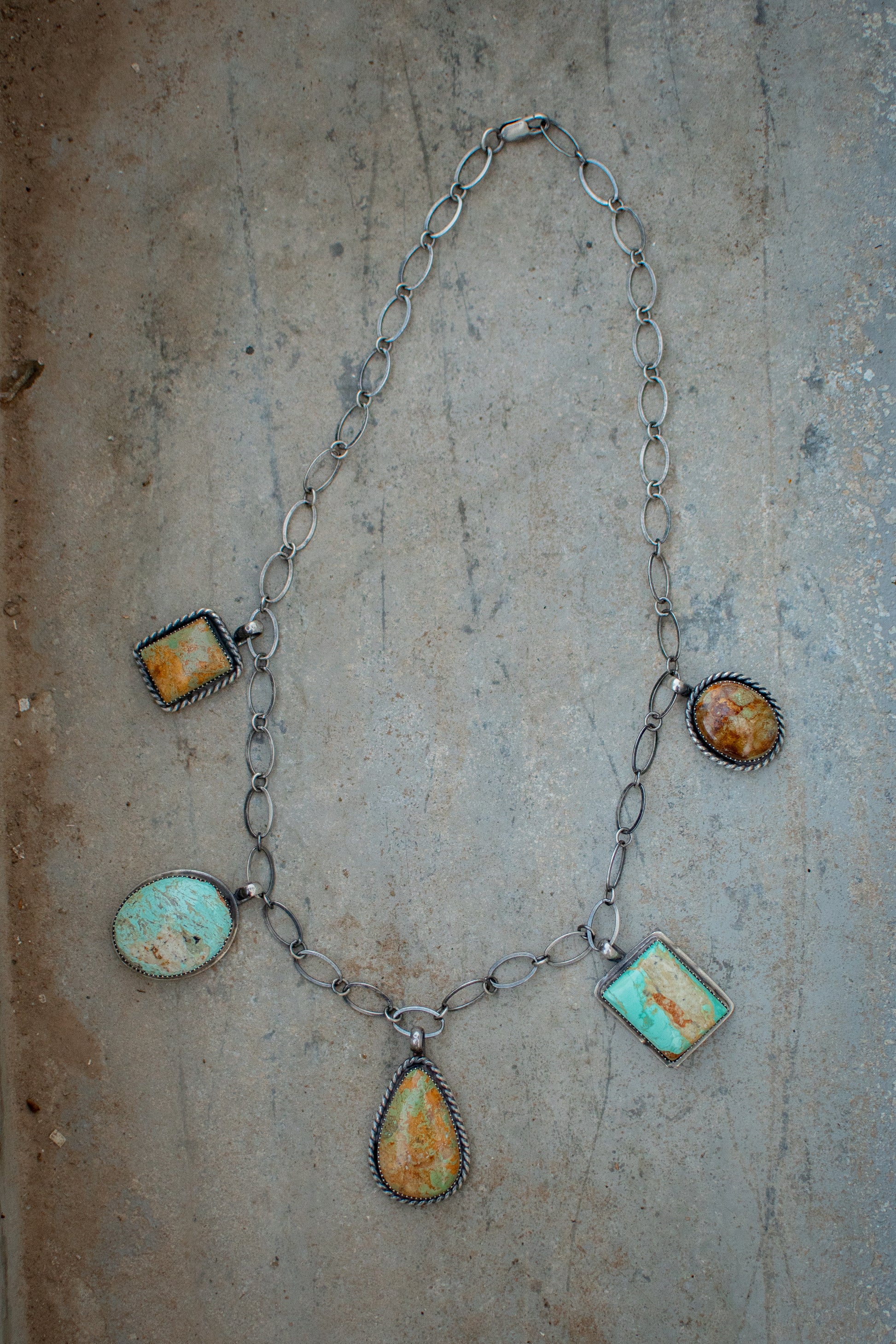 The Salinas necklace brings a chunky western charm with its striking Evans stones and twisted wire details. Designed for the spirited cowgirl, its 18" adjustable chain offers the perfect fit, making it easy to pair with any outfit. Add a playful touch of rugged elegance to your look that’s as versatile as it is bold.