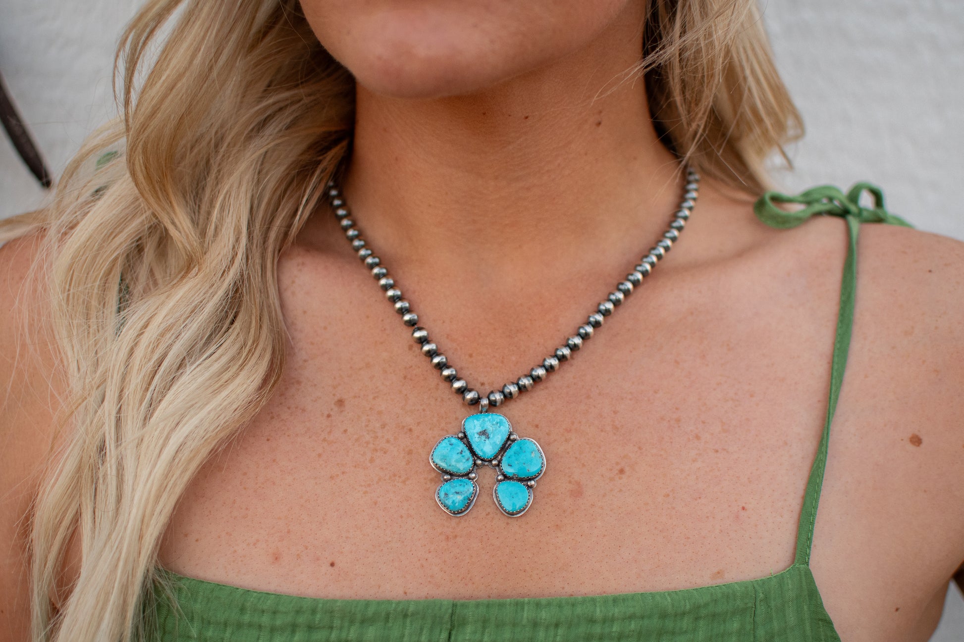 The Santa Barbra necklace: a classic western piece adorned with Sleeping Beauty turquoise, sterling silver pearls, and 6 mm pearls. Elevate any outfit with this 18-inch necklace.
