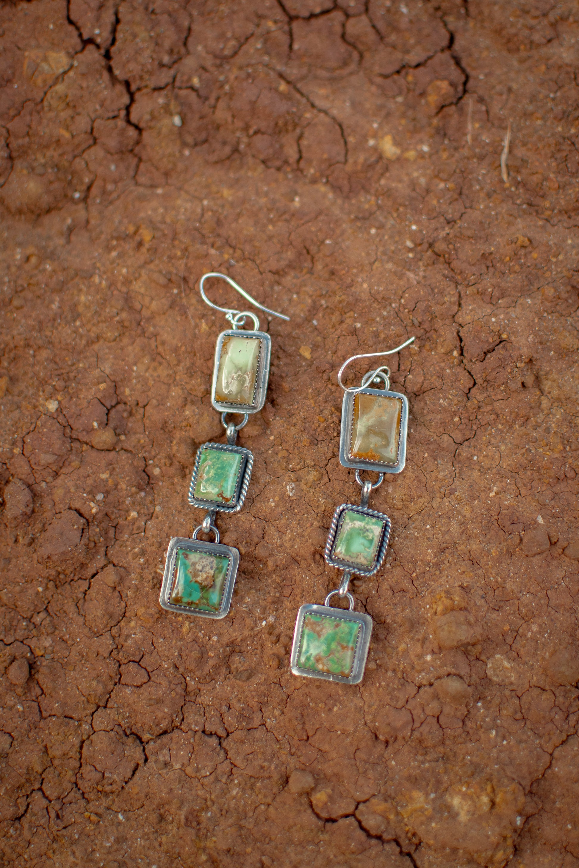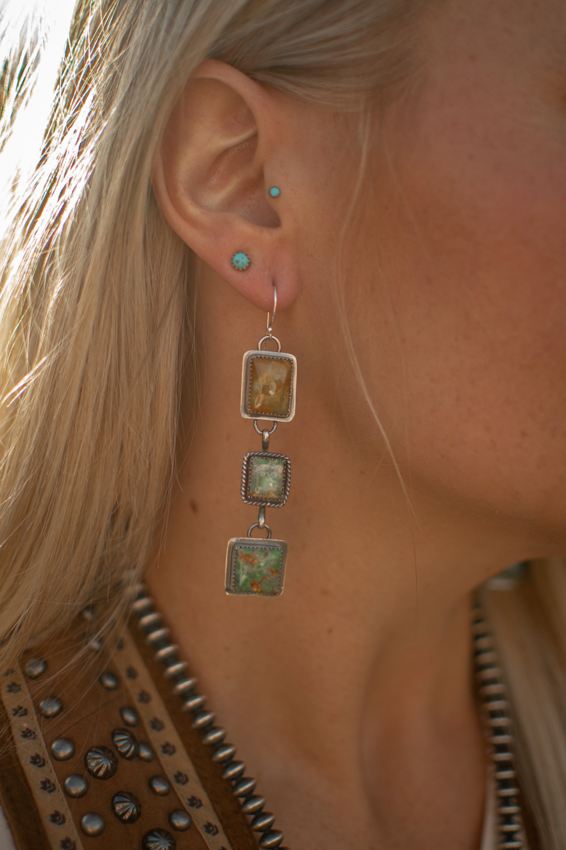 The Wild Card earrings are your ticket to effortless Western-inspired style. These three-tier dangles feature genuine Evans stone in a gorgeous palette of forest greens and chocolate browns that play beautifully together. Lightweight yet eye-catching, they're the kind of accessory that works as hard as you do—dress them up for a night out or keep them casual for everyday wear. Channel your inner outlaw with stones that have personality for days.