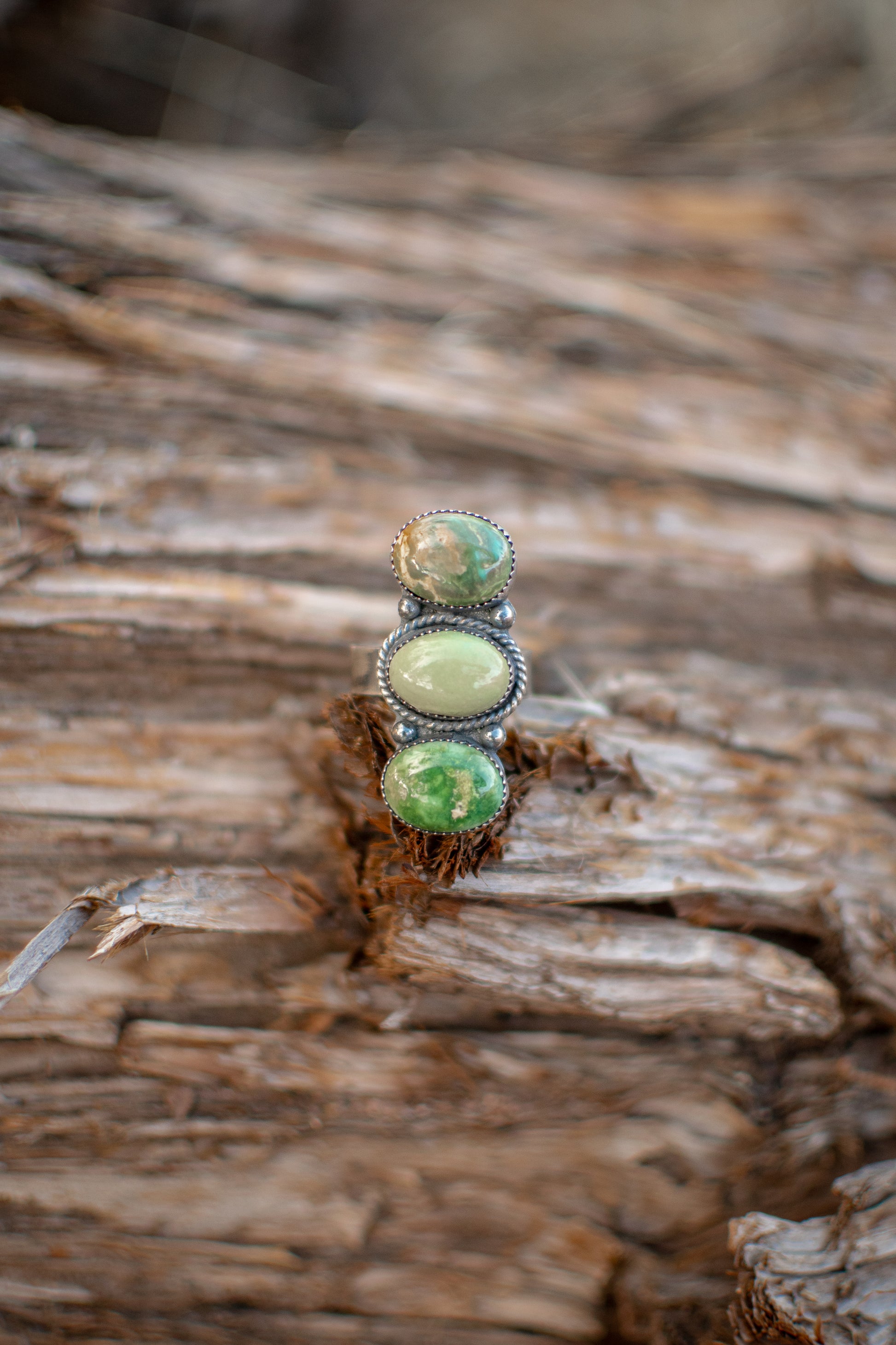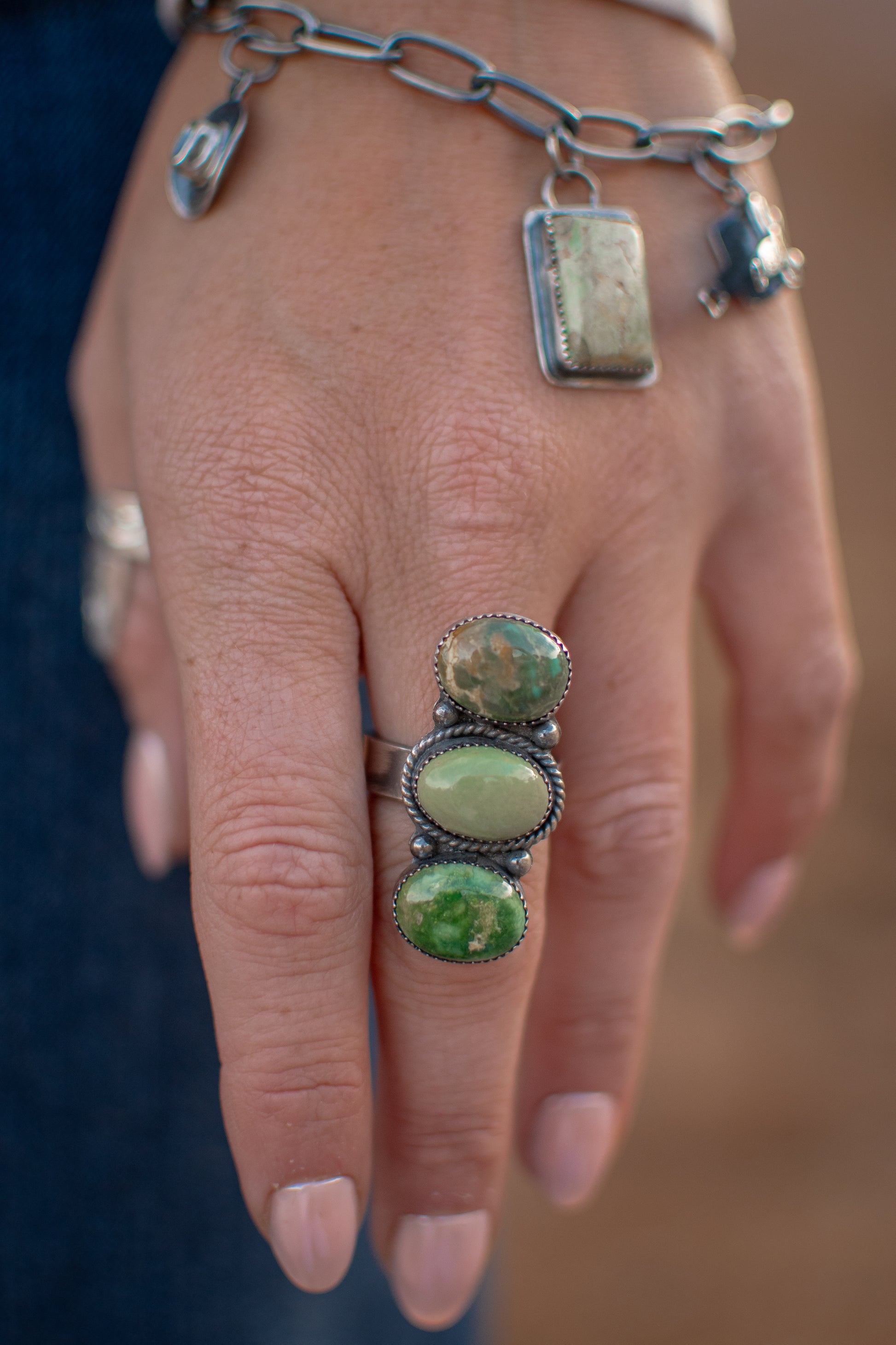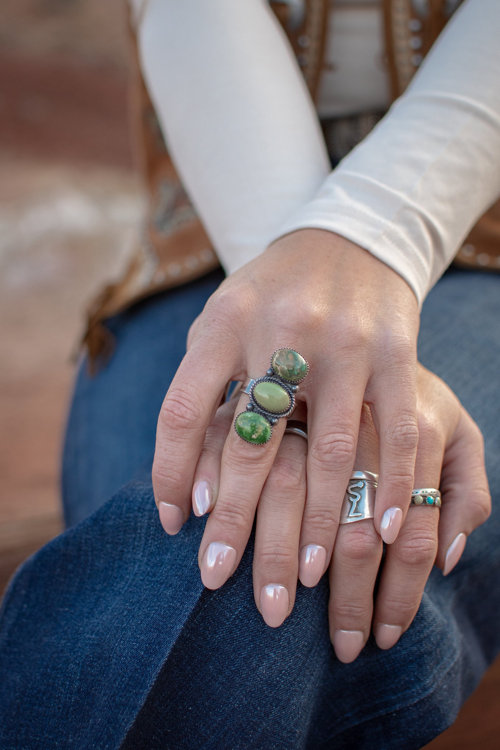 The Winners Circle is the ring every cowgirl needs in her collection. Showcasing radiant evans turquoise, this bold beauty features an adjustable band that moves with you—no matter where the day takes you. Whether you're wrangling cattle or wrangling compliments, this versatile stunner transitions seamlessly from ranch to night out. It's the kind of timeless piece that becomes your signature accessory, proving that true winners always stand out.